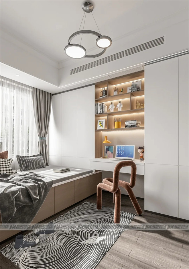 兒童房采用現(xiàn)代化的榻榻米+書桌+衣柜的一體化多功能設(shè)計(jì),既能滿足孩子休息、學(xué)習(xí)、娛樂(lè)及收納的基本要求,又保持了整體風(fēng)格的一致,美觀實(shí)用。