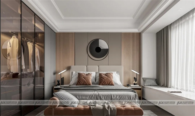 主臥的床背景是木飾面+咖色硬包拼接,并以充滿設(shè)計(jì)感的立體掛飾作為點(diǎn)綴,增添了時(shí)尚感。床頭兩側(cè)造型前衛(wèi)的臺(tái)燈,簡(jiǎn)潔不失創(chuàng)意,與臥室風(fēng)格渾然一體。