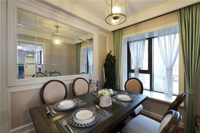 客廳色彩的選擇方面,其選擇了給人輕松作為空間色彩的基調(diào)。米藍(lán)色背景墻和純白色天花吊頂給人一種舒適感。有點(diǎn)復(fù)古的沙發(fā)與整個(gè)空間格外協(xié)調(diào)。除了沙發(fā)背景墻之外,電視背景墻采用美式簡(jiǎn)歐風(fēng),石膏線條更能襯托美式獨(dú)有的風(fēng)情,在燈光的照射下,整個(gè)空間充滿浪漫十足味道。