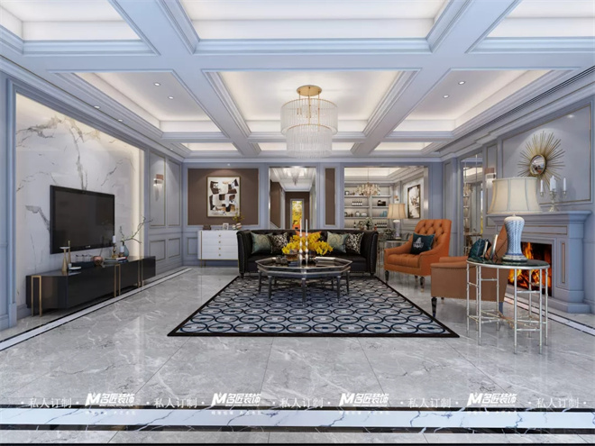 客廳圍繞美式輕奢風(fēng)格,突出都市、時尚、小資的氛圍打造,不同于傳統(tǒng)美式,更強調(diào)輕奢的格調(diào)。