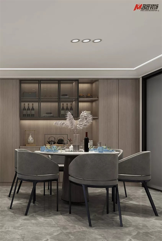 客餐廳互為一體的融合關(guān)系,最大限度地利用了光源,在轉(zhuǎn)瞬即逝的光影變化中體驗(yàn)材料的細(xì)節(jié)之處。原木紋墻柜、大理石餐桌、時(shí)尚餐椅、簡(jiǎn)約風(fēng)射燈,舒適的令人對(duì)每日三餐充滿向往和期待。