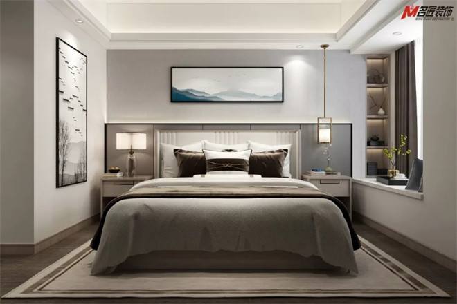 在公共空間的儒雅之外,設(shè)計(jì)師將濃重的筆墨留在了臥室。木飾紋面、精致的擺件,以和諧的比例出現(xiàn)在各處,淺灰雙人床、精美的邊柜、實(shí)用的衣櫥和床頭柜,無(wú)不展現(xiàn)出對(duì)細(xì)節(jié)的恰到好處。點(diǎn)睛之筆的壁畫(huà)和床頭燈飾呼應(yīng)了江南風(fēng)的小資情調(diào),滿懷青春的浪漫溫馨。