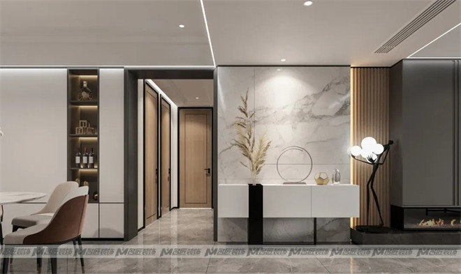 設(shè)計(jì)師巧妙的布置一組白色的玄關(guān)柜,擺上極具藝術(shù)感與美感的現(xiàn)代擺件作為裝飾,金銀交匯,空間精致感迎面而來(lái),讓人迫不及待地想入室一探究竟!