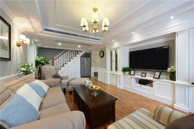 客廳色彩的選擇方面,其選擇了給人輕松作為空間色彩的基調(diào)。米藍(lán)色背景墻和純白色天花吊頂給人一種舒適感。有點(diǎn)復(fù)古的沙發(fā)與整個(gè)空間格外協(xié)調(diào)。除了沙發(fā)背景墻之外,電視背景墻采用美式簡(jiǎn)歐風(fēng),石膏線條更能襯托美式獨(dú)有的風(fēng)情,在燈光的照射下,整個(gè)空間充滿浪漫十足味道。